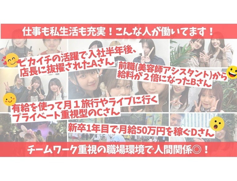 月給230,000円~ 【施術売上の35~40%】 or 【最低保証一律23万円(固定残業代含む)】 のどちらか高い方を支給! ※スキル・経験により応相談 ※役職手当、賞与あり → 会社業績により変動 ーーーーーー ↓給与実績:額面・交通費込み↓ ◆新卒入社5ヶ月 → 月給 39.4万円! ◆アイラッシュサロンから転職5ヶ月 → 月給 29.8万円! ◆美容アシスタントから転職11ヶ月 → 月給 33.8万円! ◆アイラッシュサロンから転職3ヶ月 → 月給 24.6万円! ? 未経験からでもしっかり稼げる! ? 経験者はさらに高収入も可能! あなたの頑張りがしっかり評価される環境です♪ |