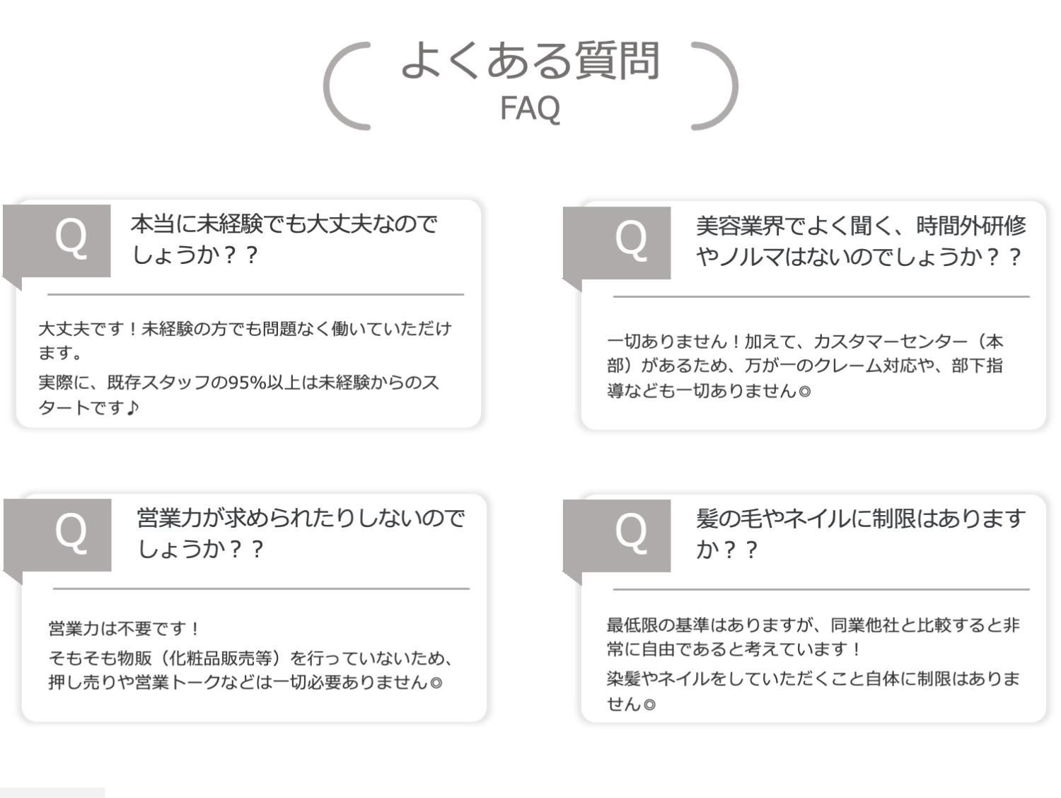 - 正社員:学歴・資格・経験不問、未経験大歓迎◎ 第二新卒・ブランク・異業種転職OK。 「美容が好き」「接客が好き」その想いだけで応募が可能です。 入社後の研修で技術はゼロから習得できるため、安心してご応募ください!、アルバイト:学歴・資格・経験不問、未経験大歓迎◎ 第二新卒・ブランク・異業種転職OK。 「美容が好き」「接客が好き」その想いだけで応募が可能です。 入社後の研修で技術はゼロから習得できるため、安心してご応募ください!、業務委託:学歴・資格・経験不問、未経験大歓迎◎ 第二新卒・ブランク・異業種転職OK。 「美容が好き」「接客が好き」その想いだけで応募が可能です。 入社後の研修で技術はゼロから習得できるため、安心してご応募ください!
